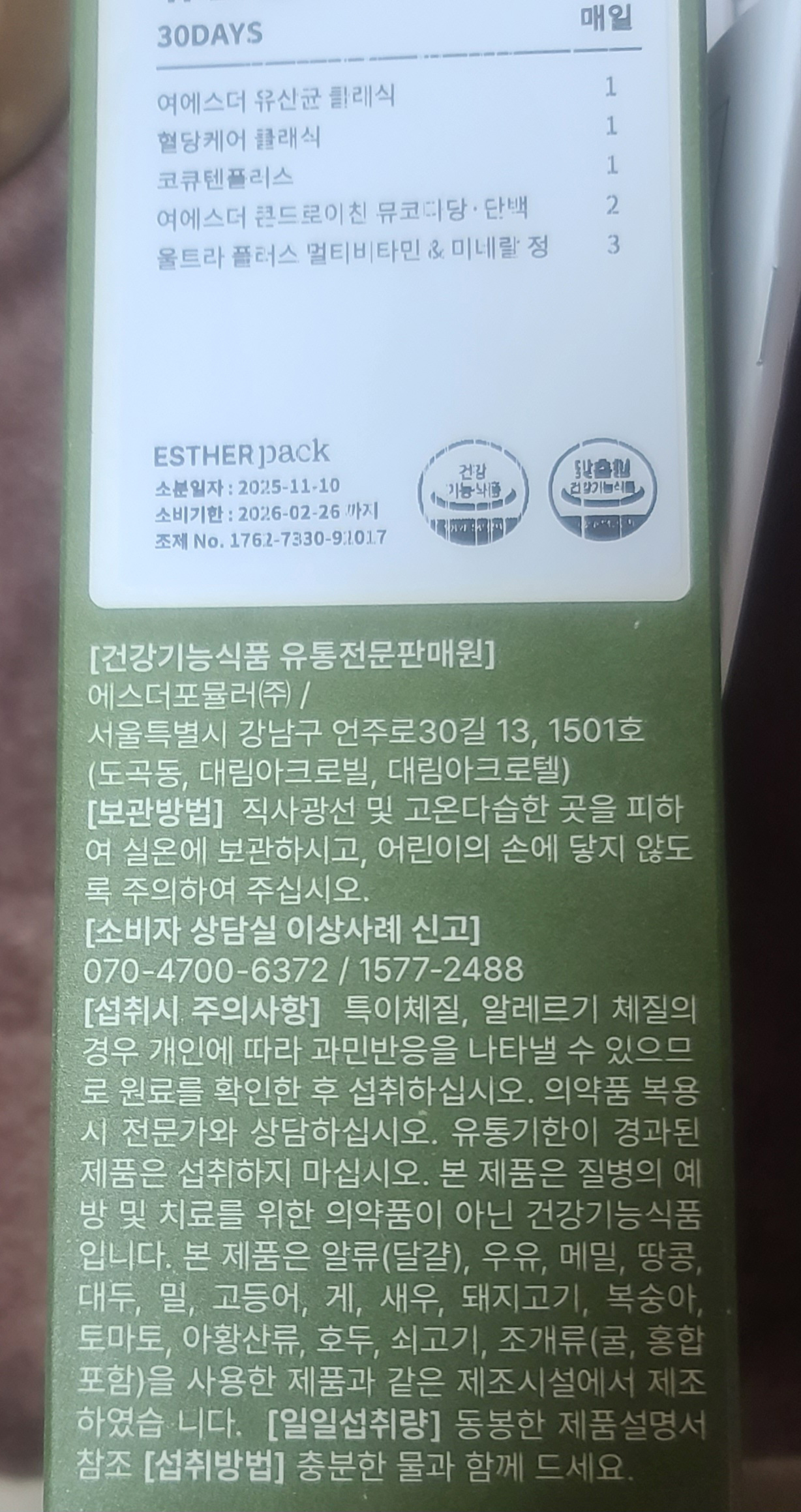 | 소비자안전을 위한 주의사항 | ※ 이상 사례 신고는 1577-2488 ※ 본 제품은 질병의 예방 및 치료를 위한 의약품이 아닙니다. ※ 본 제품은 공정거래위원회고시 소비자분쟁해결기준에 의거 교환 또는 보상을 받을 수 있습니다. ※ 본 제품은 알류(가금류), 메밀, 땅콩, 밀, 고등어, 게, 새우, 돼지고기, 복숭아, 아황산류, 호두, 닭고기, 쇠고기, 오징어, 조개류(굴, 전복, 홍합 포함), 잣을 사용한 제품과 같은 제조시설에서 제조하였습니다. |
