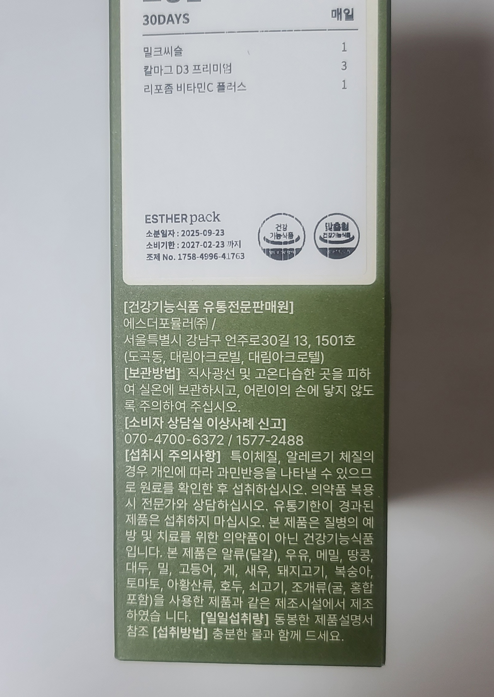 식품 등의 표시/광고에 관한 법률에 따른 표시사항 | 건강기능식품에 관한 법률에 따른 심의 필함 - 스킨케어 포뮬러: 231212475 /닥터에스더 리포좀 비타민C 플러스: 230511743 / 닥터에스더 코큐텐 플러스: 231212515 |